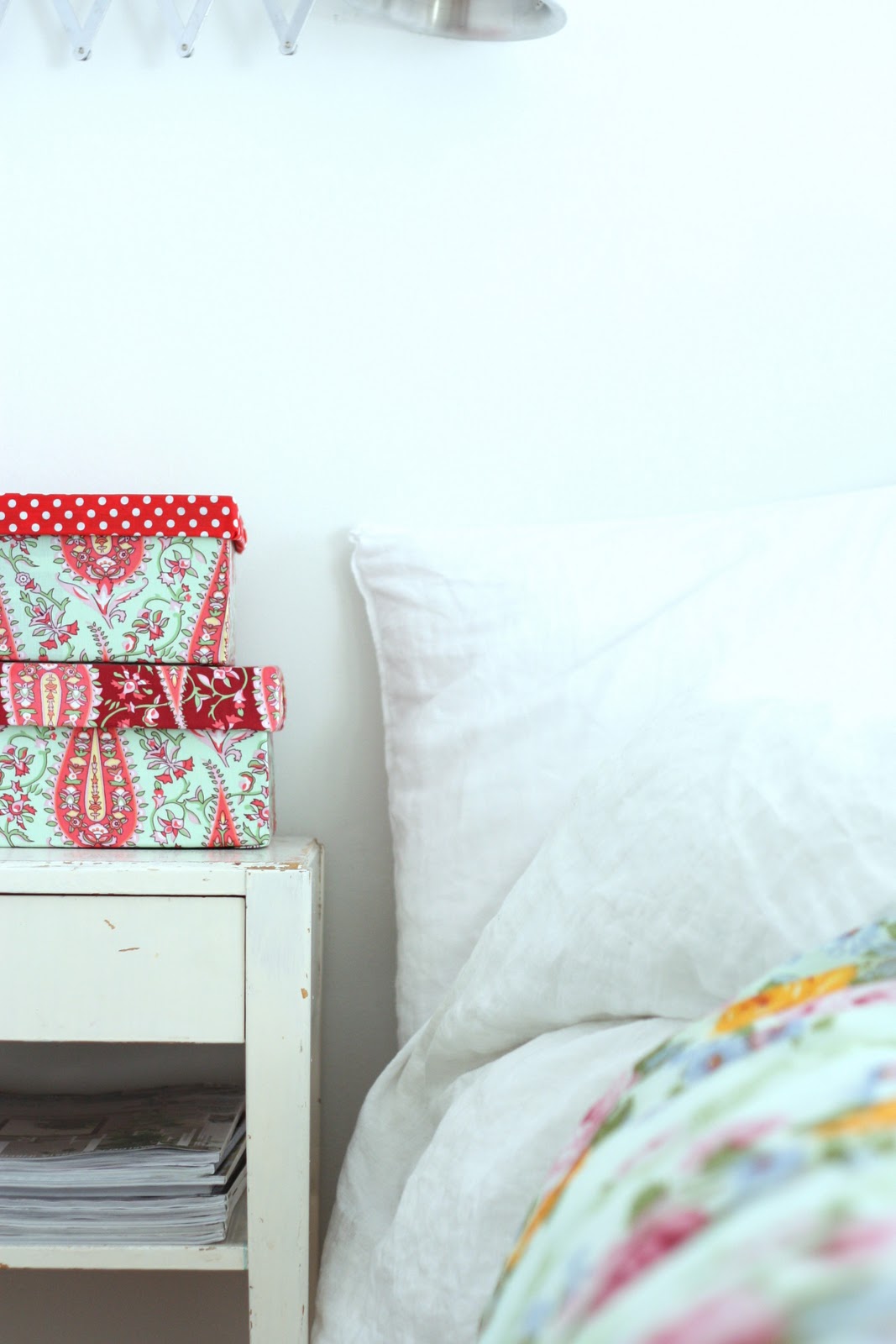 En nyt ehkä lähtisi Manoloiden laatikkoja päälystämään (joita mulla ei siis ole yhtään!), mutta aika monet kenkälaatikot on rumia pitää esillä. Pahvisia säilytyslaatikoita saa esim. Tiimarista, mutta ne on usein vähän tylsiä. Lasten kengät myydään söpön pienissä kenkälaatikoissa, ja niistä saa kivoja säilytyspaikkoja vaikka onnittelukorteille, ja muulle pienelle tavaralle, jota haluaa säilyttää muistona. Kangasta ei hommassa tarvita paljon, joten materiaaliksi käy niin tilkut, kuin vanhat vaatteet tai kodintekstiilitkin.