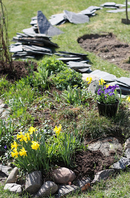 Koko rivi ruohosipulia, muutama vako täynnä kelta- ja punasipulia, liuskekiviä hoitoa helpottamaan, porkkanaa, auringonkukkia ja muita maljakkoon poimittavia sekä viimeisenä rivit mansikkaa. Kaikki ne mansikantaimet, jotka tässä pihassa vielä hengissä pihisivät. Kivien viereen jätin tilaa kesäkurpitsantaimille.