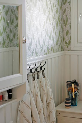 Veskiin laitettiin ne Sandbergin kielot. Sopii kivasti helmipontin kaveriksi. Vessa on meillä tosi tosi pieni, joten puoli seinää kuviotapettia on just hyvä määrä. Vielä pitää silmän hiukan tottua, tila tuntuu nimittäin nyt entistä pienemmältä. Hiuksia harjatessa varoo isoja liikkeitä ja pelkää osuvansa seinään 🙂