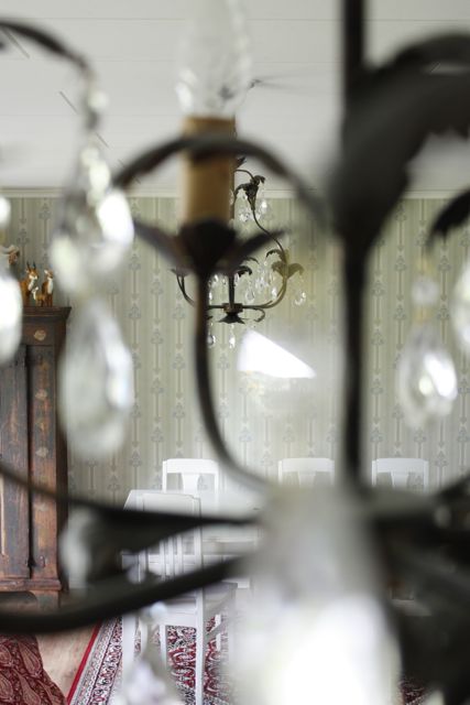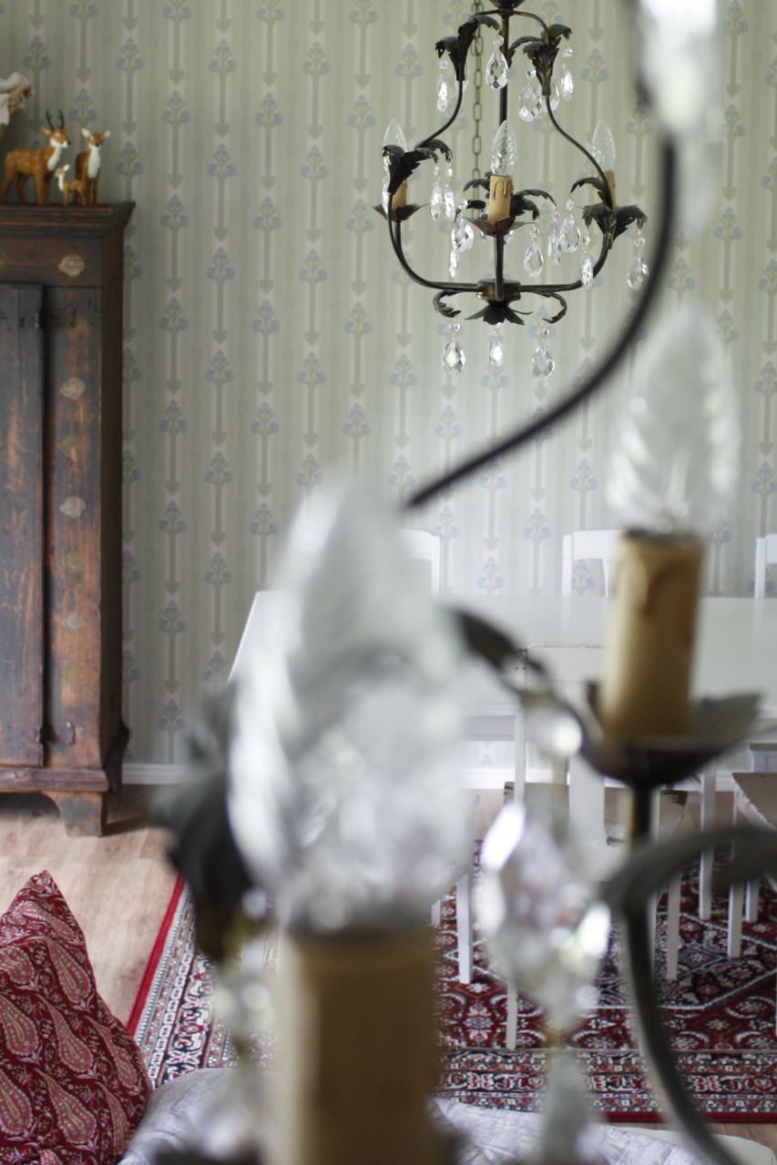 Eli Nuo kaksi kruunua olisi tarkoitus siirtää tuonne ruokapöydän ylle. Nyt valaisimet on hassun korkealla, jotta niiden alta mahtuu kulkemaan, mutta pöydän päällä ne saavat roikkua huomattavasti matalammalla (katossa roikkuu jo ketju, joka kruunuista aikoinaan poistettiin, ikään kuin homman havainnollistamiseksi).