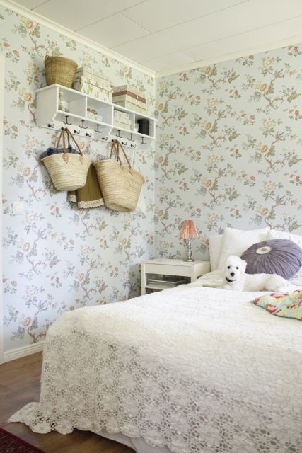 >Mie tykkään, tapetista ja koko teidän makkarista! Tapettikuvio on kyllä romanttinen, mutta eihän tuo mitään ylitsepursuavaa romanssia ole.: )