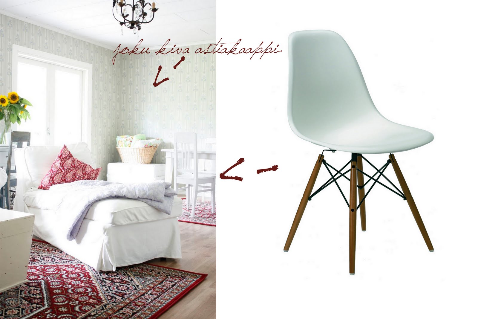 >Kaunista !Tein juuri tilauksen ruokapöydän tuoleista. Olisin halunnut Eamesit ( tai oikeastaan mies on niihin enemmän ihastunut ), mutta niissä on niin matala istuikorkeus ( ja ne kuulemma hiostavat pitkään istuessa ) että hylkäsin ne. Hienot ne kyllä ovat, varsinkin noilla puujaloilla. Päädyimme Tolix-tuoleihin, niiden jonotusaika vaan on piiitkä. Mukavaa tiistaipäivää sinne !