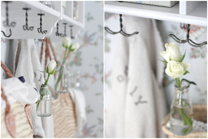 Pieni hattuhyllynaulakko kannattelee asusteet, korut ja tuoksut. Luku- ja tunnelmavaloa on tietysti yleisvalon lisäksi. Ja kukkia! Tuoreita kukkia ei sovi tietenkään unohtaa.