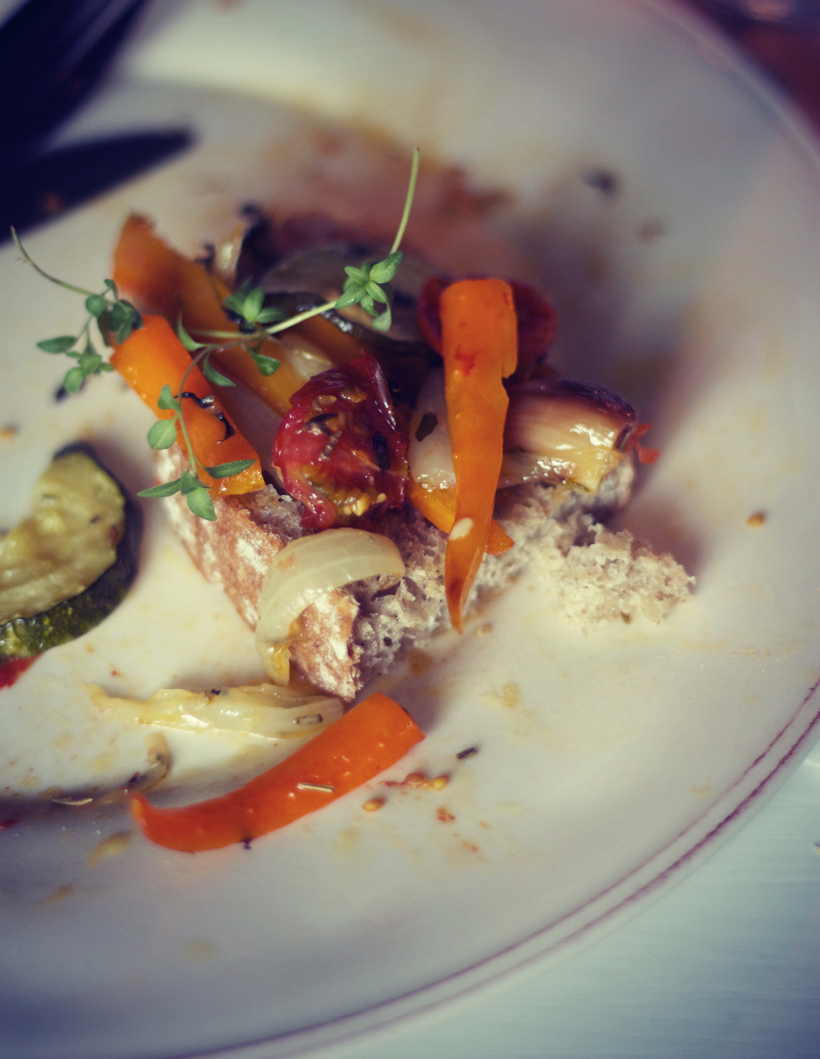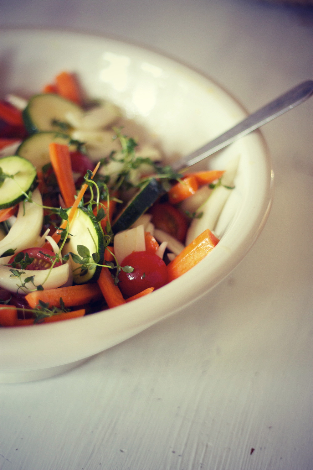 Porkkanatikkuja, puolikkaita kirsikkatomaatteja, sipulin lohkoja, kokonaisia valkosipulin kynsiä ja kesäkurpitsan viipaleita. Pyörittele rosmariinilla ja timjamilla maustetussa oliiviöljyssä. Heitä mukaan sormisuolaa ja hyppysellinen sokeria tai lusikallinen hunajaa. Pelille ja uuniin. 200°C n. 40-50 minuuttia.