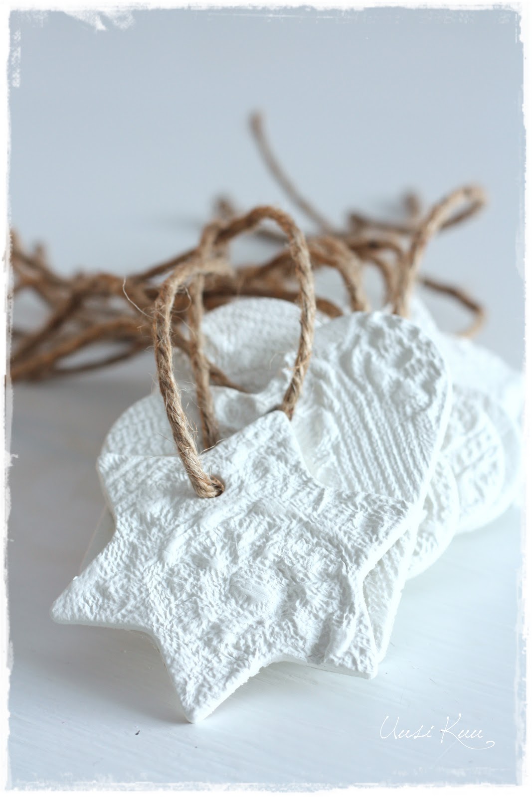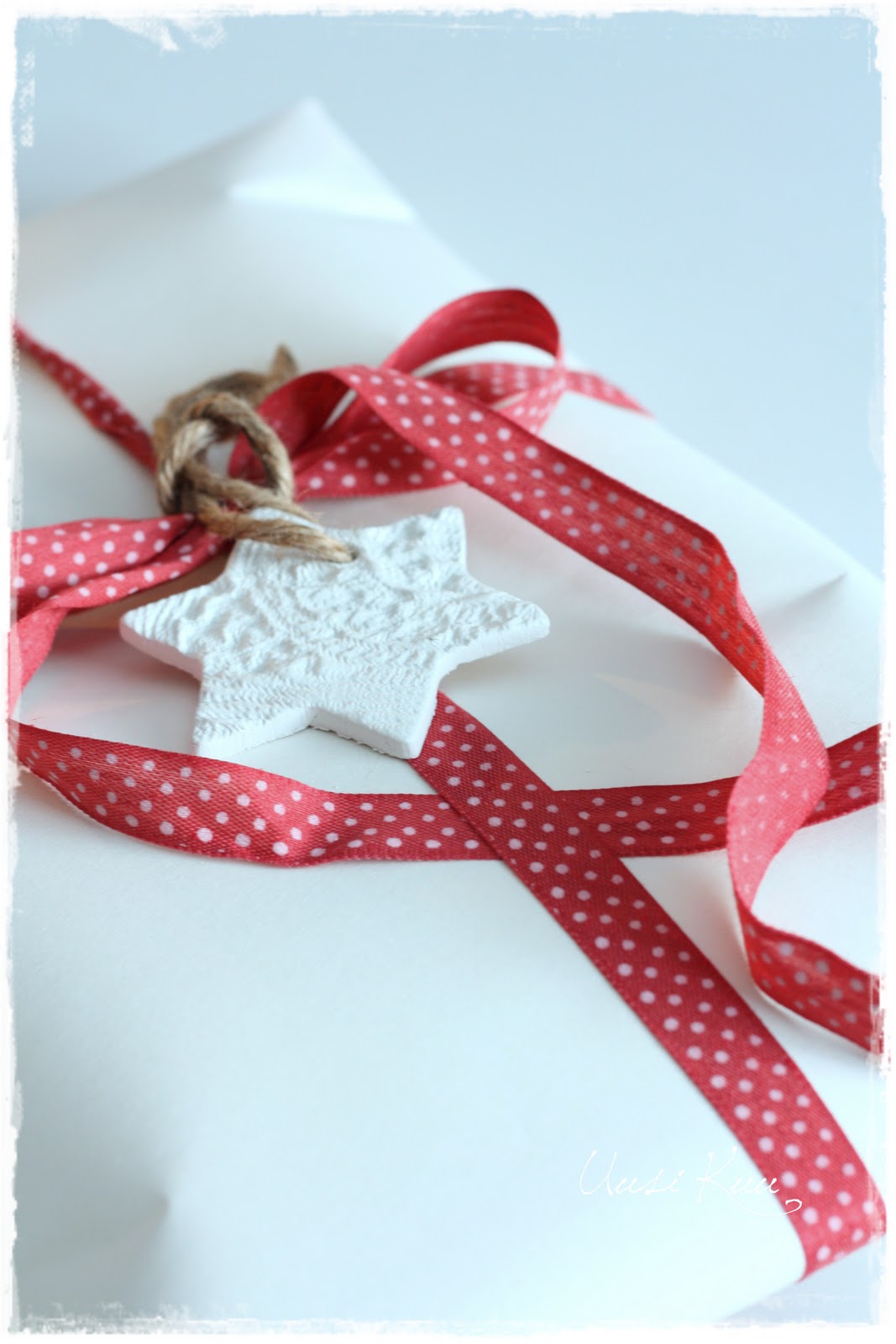 Pari kuvaa joulupakettiprojektista. Pakettikorteiksi kaulin pitsiliinan avulla askartelumassaa. Käyvätpä vaikka kuusenkoristeiksi varsinaisen käytön jälkeen. Lisää lahjoista ja paketoinneista ensi viikolla.