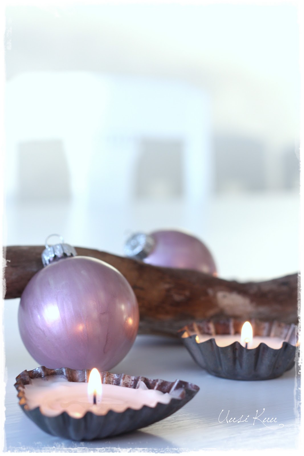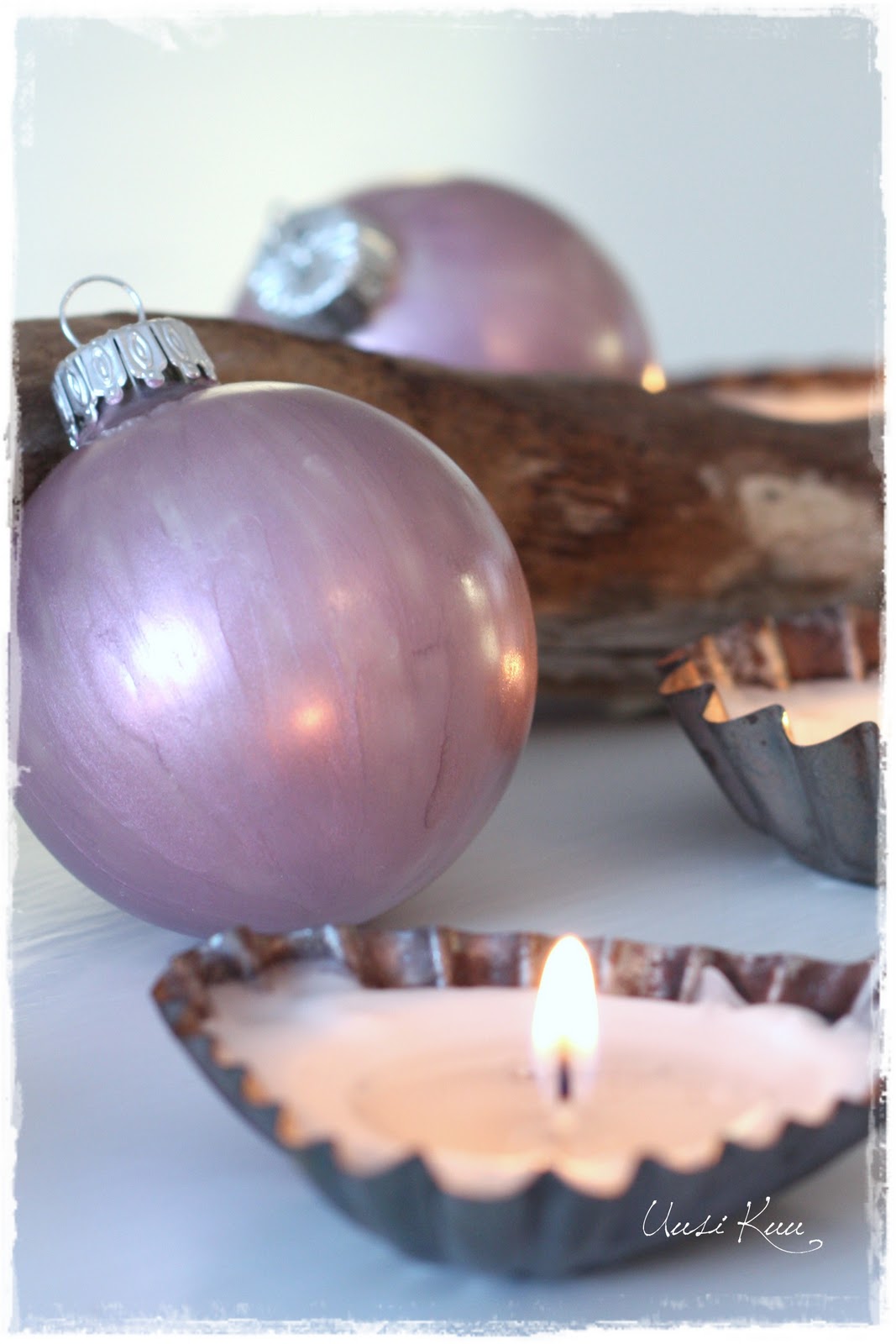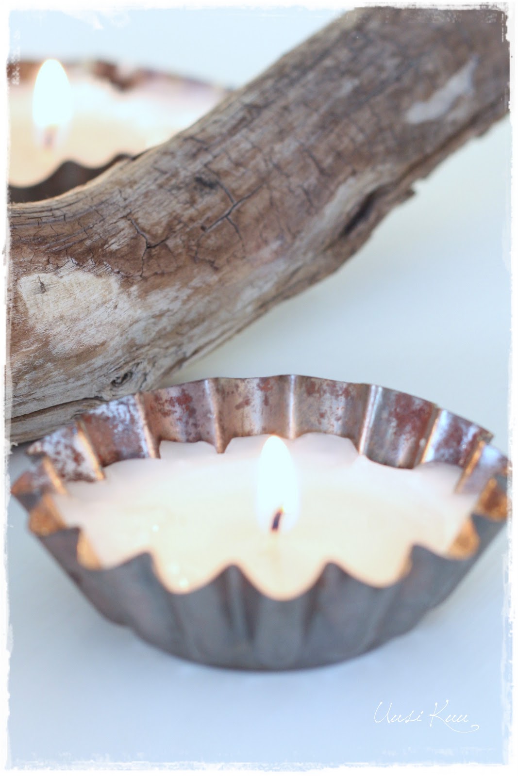 Pienet muotit ovat nekin kirppiksiltä löydettyjä. Laitoin niihin lämpökynttilät ilman metallikuppiaan, ja steariinin sulettua ja levittyä koko muotin leveydelle, lisäsin joukkoon hienonnettua kynttilänjämää. Näin paloaika pysyy pitkänä, eikä sydänlanka pala liian nopeasti.