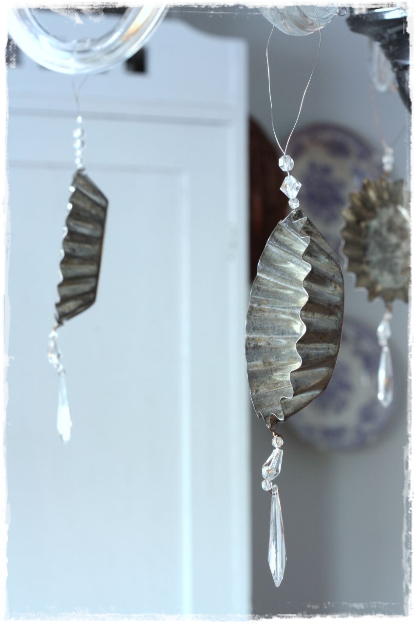 Keittiön kruunuun olen ripustanut itsetehdyt koristeet. Vanhat muotit on kirpputoreilta, “kristallit” ja myrttilanka tiimarista. T porasi reiät.